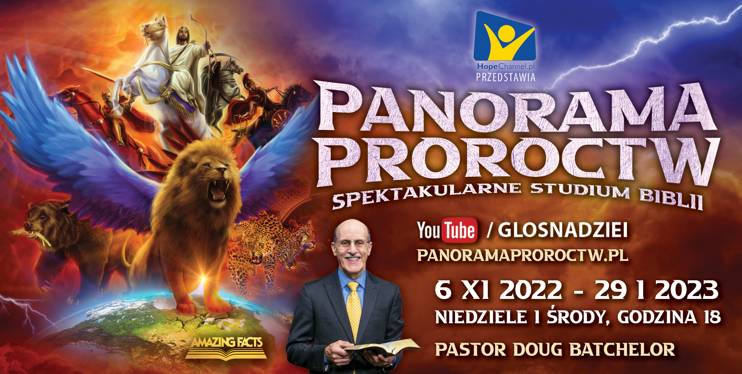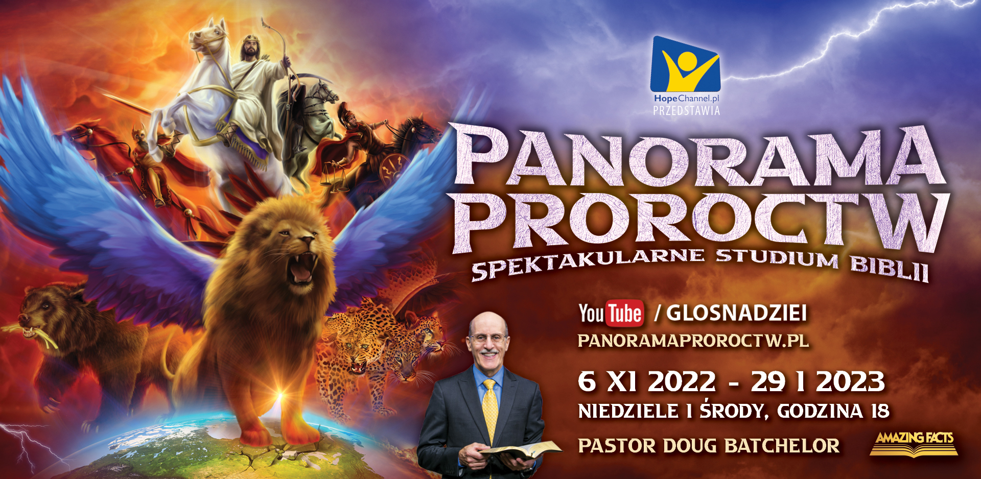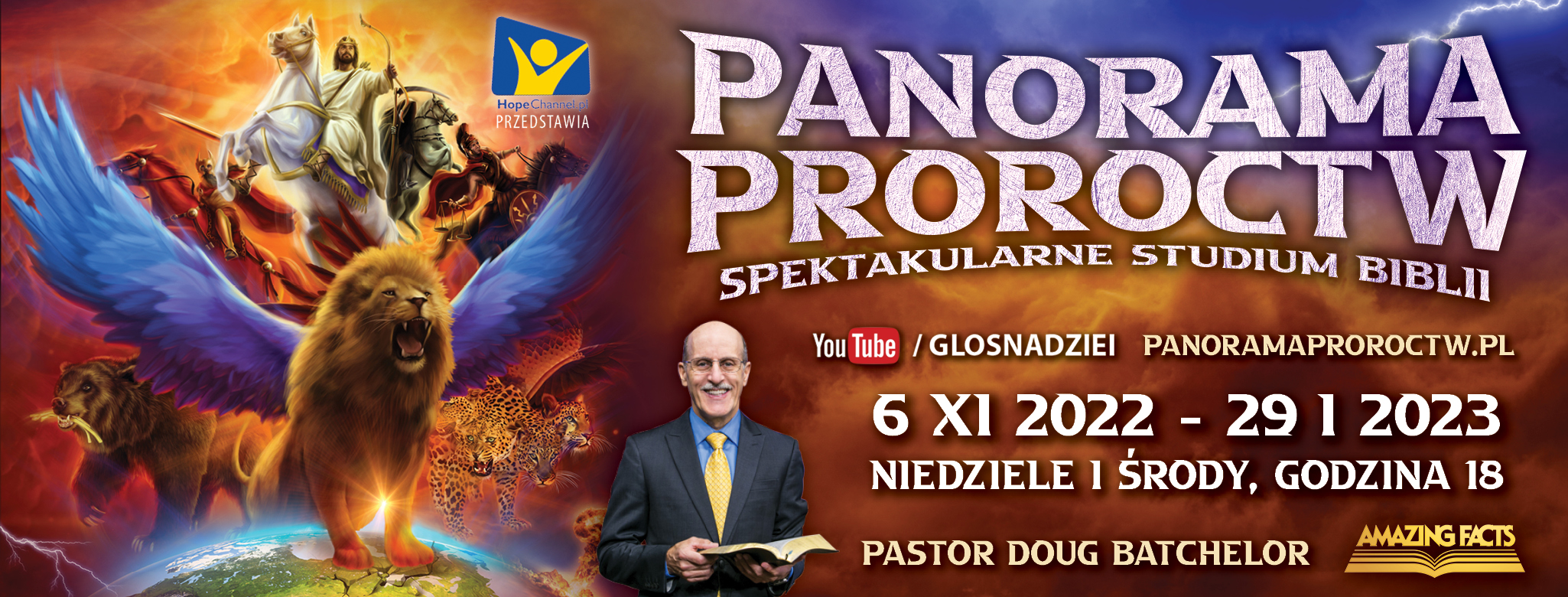 Zapraszamy Was do udziału w nowej serii wykładów biblijnych pt. PANORAMA PROROCTW. Głównym mówcą jest pastor DOUG BATCHELOR znany z wielu programów realizowanych przez Amazing Facts, adwentystyczną stację telewizyjną w Stanach Zjednoczonych.